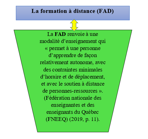 Selon la Fédération nationale des enseignantes et des enseignants du Québec (FNEEQ) (2019, p. 11), la FAD renvoie à une modalité d’enseignement qui « permet à une personne d’apprendre de façon relativement autonome, avec des contraintes minimales d’horaire et de déplacement, et avec le soutien à distance de personnes-ressources » (Figure 1).