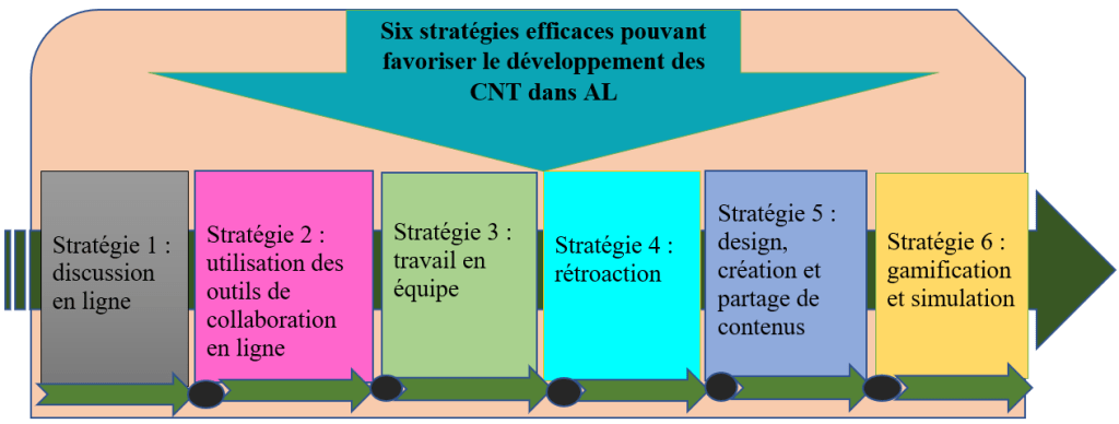 Les résultats de la recherche CompeTI.CA et notre recension des écrits nous ont permis d’identifier six stratégies efficaces pouvant favoriser le développement des CNT dans l’AL : la discussion en ligne, la collaboration en ligne, la création et le partage de contenus, le travail d’équipe, la rétroaction et la gamification. Nous présentons quelques exemples des pratiques gagnantes pour la mise œuvre de chaque stratégie technopédagogique, ainsi que les CNT qui pourraient être développées par les apprenants.es (Figure ci-dessous) :
